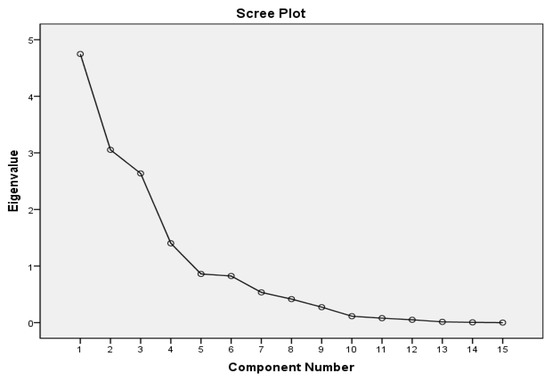 The degree of total variance interpreted by the extracted factors is shown in Table 5. There are two groups of datasets; each has three columns of data, in turns: the eigenvalue of the factor, the contribution rate of variance interpretation, and the accumulative contribution rate of variance interpretation. In the first group dataset, 78.923% of the total variance of the 15 indicators was interpreted by the four factors before rotation. The second group dataset is the ultimate factor solution after rotation. The accumulative contribution rate of variance interpreted after rotation is not changed. However, after rotation, the factor contributions to the 15 indicators are reallocated, and the meanings of the four factors are less obscure.