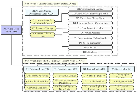 At present, there is no credible indicator system for measuring state fragility other than FSI. We will study the impact of climate change on the “fragile state”, and the construction method of the sustainable development index system based on the environment will provide reference value. In 1992, the United Nations Commission for Sustainable Development (UNCSD) proposed the “Driving Force State Response” (DSR) indicator system. In 1995, the World Bank proposed a new sustainable development indicator system. The new system integrates the four elements: nature, production, manpower, and society [33]. In fact, various sectors including international organizations and governments have developed hundreds of evaluation systems on a global scale. Although the contents of their indicators are different, their construction methods are similar.