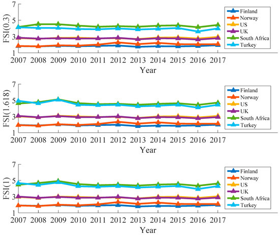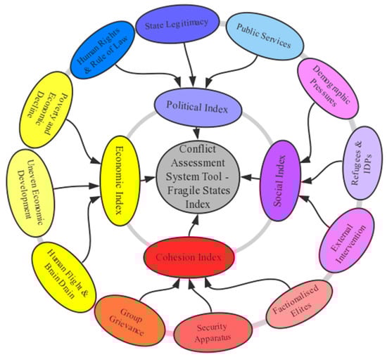 A fragile state is a low-income country characterized by weak national capacity and legislative defection which makes citizens vulnerable to a range of shocks [1]. A common indicator of state fragility is the World Bank’s Country Policy and Institutional Assessment index. However, this indicator focuses on the quality, efficiency, and transparency of the public sector [2]. Principles related to fragile states have been put forward by many international organizations, such as the World Bank, and the Organization for Economic Co-operation and Development (OECD) [3]. The US and the EU announced that a failed state is a major threat to national security separately in 2002 and 2003 [3,4]. Since 2005, the Fund for Peace (FFP) and Foreign Policy have released the Fragile States Index (FSI) every year according to a systematical evaluation, which can identify three main perspectives—society, economy and policy; the Fragile State Index consists of 12 individual indicators ranging from 0 to 10 and is obtained by comprehensive evaluation of 12 indicators. This calculation method is simple and easy but does not take the different weight varying from different indicators into consideration.