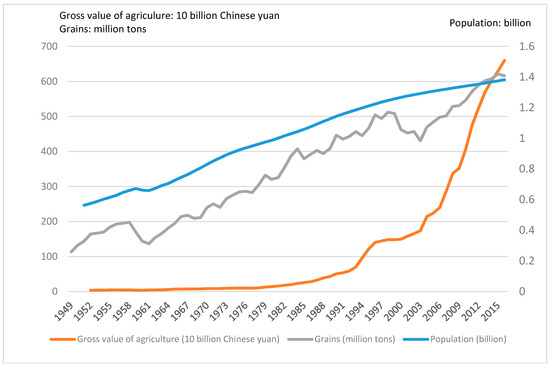 The remarkable achievement associated with the Chinese government’s ability to feed 22% of the world’s population on 9% of the planet’s arable land is well-recognized. The population of China has rapidly increased over the past decades, which exerted steady pressure on China to keep expanding its agricultural production. Figure 2 shows the historical trends of population, gross value of agriculture, and grain production in China. Except for the 1958–1961 crisis shown in the figure by the decreasing trend, the agriculture sector has grown during most periods. The growth slowed down after 1997, which triggered some discussions about whether China could feed herself in the future as the population continued to grow [14,15]. The agricultural sector took off again after 2003, and China became a net exporter of agricultural commodities. Since 2008, the sector contributed to total factor productivity (TFP) growth as much as China’s non-agricultural sectors [16]. By the end of 2016, grain production was 0.62 billion tons, and the cultivated land reached 13.5 million km2. Although agricultural production is growing rapidly, food security still remains a top priority in China.