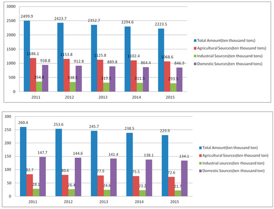 Discharge of COD (Top) and ammonia (Bottom) nitrogen from various sources in China. Data source: China’s Environment Statistics Yearbook (2011–2015).