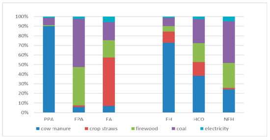 From the energy structure perspective, farming households in PPA were mainly dependent on cow manure, accounting for 90.10% of their total energy consumption, while the main energy sources for FPA were coal (49.80%) and firewood (40.06%), and in FA it was straw (50.30%) (Figure 2). Previous studies also found that the pastoralists in Qinghai and Tibet used yak dung and sheep fecal pellets as their main energy sources [32], even though a study on China’s rural energy structure found that the proportions of straw, firewood, biogas, coal, oil, LPG, electricity, and solar energy in rural residential energy consumption shifted from, respectively, 49.36%, 30.99%, 0.25%, 18.12%, 0.38%, 0.004%, 0.83%, and 0.08% in 1991 to 35.71%, 20.19%, 3.31%, 17.55%, 4.85%, 2.61%, 11.90%, and 3.87% in 2014 [33]. In our research, we found that the proportion using commercial energy (coal and electricity) among PFH, HCO, and NFH showed an upward trend, accounting for 9.9%, 27.81%, and 48.41%, respectively. Biomass has been used for cooking and heating for thousands of years on the Qinghai–Tibet plateau [34], but our study indicated that the consumption of biomass energy showed a declining curve from 90.11% to 72.18% to 51.59%.