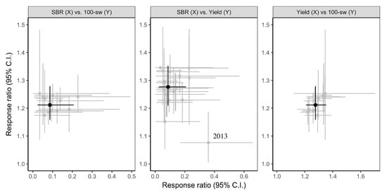 Weighted, bootstrapped means of response ratios for the effect of fungicide application on soybean rust (SBR) severity versus 100-seed weight (SBR vs. 100-sw), SBR severity versus yield (SBR vs. Yield), and yield versus 100-seed weight (Yield vs. 100-sw) for different moderator classes (grey), and for the mean effect across all studies (black). We only analyzed moderator level categories with at least 15 individual entries from at least five different studies. Error bars are 95% confidence intervals (CIs). The results from 2013 fungicide trials are highlighted on the SBR vs. Yield plot; see text for details.