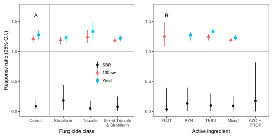Although we only had enough studies and study entries to analyze the mean effects of two fungicide classes, including quinone outside inhibitors (strobilurins), and demethylation inhibitors (triazoles); and four active ingredients, including pyraclostrobin, flutriafol, tebuconazole, and mixed active ingredients, we detected significant decreases in SBR severity, and increases in yield and 100-seed weight, regardless of class or active ingredient (Figure 2, Table 2 and Table S1).