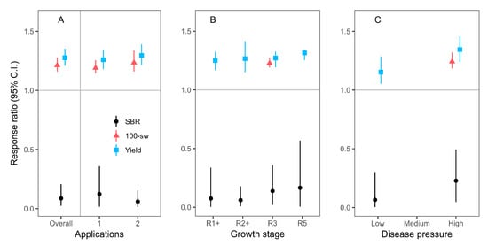 Although fungicides were applied anywhere from one to five times, we only had sample sizes large enough to merit meta-analysis of effects when fungicides were applied one or two times (Figure 3, Table 2 and Table S2). Fungicides were first applied during five different growth stages varying from vegetative stage (V) through to beginning seed (R5), but we only had enough studies to analyze mean effects when fungicides were initially applied to plants that were in first bloom (R1), full flowering (R2), beginning pod development (R3), and full seed (R5) growth stages (Figure 3 and Table 2). For the studies with fungicides applied during the R1 and R2 stages, the investigators also applied fungicides a second time during a more developmentally advanced growth stage (i.e., two total applications). The weighted, bootstrapped means of response ratios were significantly below 1.0 for SBR severity, and above 1.0 for yield and 100-seed weight, thus signifying fungicide efficacy regardless of the number of applications, or the growth stage at the time of initial fungicide application (Figure 3 and Table 2). Disease pressure, measured by mean SBR severity in untreated control plants, was most often at low () or high (>70%) levels, with not enough medium-disease-pressure studies to conduct a sub-group meta-analysis for medium disease pressure. There was an indication that the weighted, bootstrapped means of response ratios for yield were higher when disease pressure was high, relative to low; however, a weak, opposite trend was detected for SBR severity (Figure 3 and Table 2).