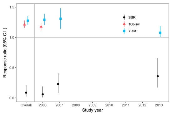 The majority of studies were conducted in 2006, 2007, and 2013 (Table 1, Table 2 and Table S2). There were fewer studies between 2008 and 2012 to include in this analysis, partly due to the lack of significant development of SBR in previous years, resulting in fewer industry-funded fungicide trials in the southeast region during this period. Also, severe droughts during the growing season in 2010 and 2011 in the southeastern US resulted in minimal SBR pressure in the states typically conducting SBR studies []. Our meta-analysis results indicated that fungicides reduced SBR severity in treated plants relative to untreated controls (i.e., response ratio <1.0), regardless of the year of the study (Figure 4 and Table 2). Likewise, the weighted, bootstrapped means, and 95% confidence intervals of response ratios for yield and 100-seed weight were above 1.0, indicating fungicide efficacy regardless of year (Figure 4 and Table 2). However, there was a trend indicating that the efficacy of fungicide in controlling SBR severity, or increasing yield was lower in 2013, when compared with 2006 or 2007 (Figure 4 and Table 2).