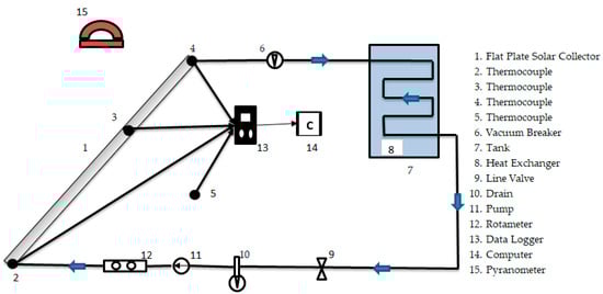 where FR, (τα), and UL are the heat removal factor, absorptance-transmittance product, and overall loss coefficient of the solar collector, respectively. To calculate the thermal efficiency, as shown in Equations (5) and (6), we divided by the energy input [4]: