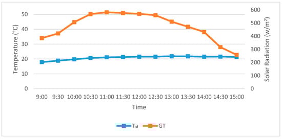 Figure 2 represents an average recorded data of solar radiation (W/m2) and ambient temperature (°C) between 9 a.m. and 3 p.m. in November.