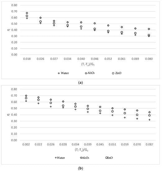 3.1. Efficiency vs. (Ti − Ta)/GT for Nanofluid without Ethylene Glycol