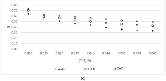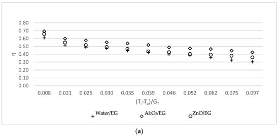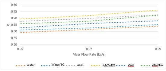 In comparison with water/EG, the efficiency increase at these mass flow rates was 8.56%, 10.28%, and 13.34%, respectively when using Al2O3-water/EG, and the efficiency enhanced by 4.41%, 5.68%, and 6.86%, respectively, when using ZnO-water/EG, as can be seen in Figure 4.