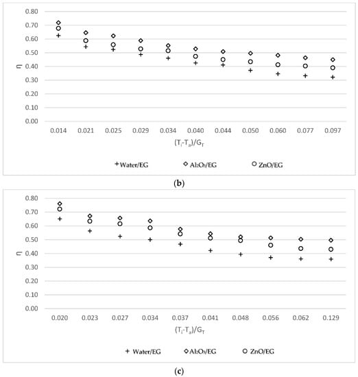 Variations of collector efficiency using working fluid/EG versus the reduced temperature parameter (a) for the 0.05 kg/s mass flow rate; (b) for the 0.07 kg/s mass flow rate; and (c) for the 0.09 kg/s mass flow rate.
