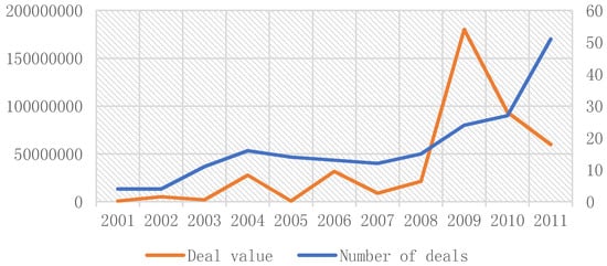 Cross-border acquisition data comes from the BvD (Zephyr) database. The BvD (Zephyr) database is a well-known database in the field of international M&A. Currently, it has collected more than 1 million M&A transaction records from various industries around the world, adding an average of approximately 100,000 M&A transactions each year. The data can be traced back to 1997 and covers transaction records in Asia Pacific and China. This database is a widely recognized and used by scholars in the fields of M&A research. We have screened the data according to the following principles: First, this paper screened the transaction data of Cross-border M&A events of China’s listed companies (excluding those outside mainland of China) from 2001 to 2011. Multiple mergers and acquisitions that occur in the same year and in the same company are calculated based on the maximum transaction amount. Second, it uses the obtained data of the acquirer to compare with the basic information of the listed companies in the CSMAR database to determine the corporates’ code, as well as its industry and region. Third, it excludes the sample of the acquiring party as an individual, and excludes ST and PT companies, and eventually obtained a total of 191 M&A transactions. The CSMAR database is a professional standard of Guotai An Information Technology Co., Ltd. (Shenzhen, China) that draws on the internationally renowned databases of CRSP, Compustat, TAQ, I/B/E/S, Thomson, etc., and combines economic and financial development with China’s actual national conditions. It has covered 18 series including factor research, character characteristics, green economy, stocks, and companies, including 130 databases, more than 4000 tables, and more than 40,000 fields. The further description of the sample is shown in Table 1, Figure 3.