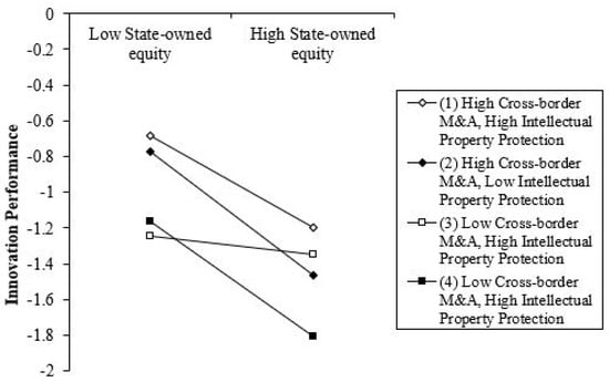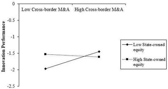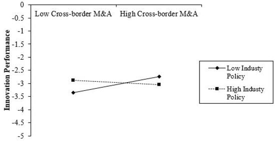 As can be seen from Table 4, cross-border mergers and acquisitions in Model 1 have a significant positive effect on the acquirers’ innovation performance (β = 0.115, p < 0.01). Hypothesis 1 is verified. This shows that cross-border mergers and acquisitions by Chinese companies have significantly improved the acquirers’ innovation performance. In Model 2, cross-border mergers and acquisitions have a significant positive effect on the innovation performance (β = 0.110, p < 0.05), but the direct impact of industrial policies on the acquirers’ innovation performance is not significant. Model 3, cross-border mergers and acquisitions have a significant positive effect on the acquirers’ innovation performance (β = 0.114, p < 0.01). At the same time, industrial policies have a significant negative regulatory effect on the relationship between cross-border M&A and the acquirers’ innovation performance (β = −0.197, p < 0.05). Hypothesis 2b is verified (Hypothesis 2a is not verified). This shows that the industrial policy has a more pronounced inhibitory effect on the relationship between cross-border M&A and the acquirers’ innovation performance. In Model 4, cross-border M&A has a significant positive effect on the acquirers’ innovation performance (β = 0.131, p < 0.01). At the same time, IPP has a significant direct effect on the acquirers’ innovation performance (β = 0.122, p < 0.1). Model 5, cross-border mergers and acquisitions have a significant positive effect on the acquirers’ innovation performance (β = 0.141, p < 0.01), but the effect of IPP on the relationship between cross-border M&A and the acquirers’ innovation performance is not significant (β = −0.0124, p > 0.10). Hypothesis 3a and 3b have not been verified. This shows that although intellectual property protection has a positive direct impact on the acquirers’ innovation performance, it does not have a significant regulatory effect on the relationship between cross-border M&A firms and the acquirers’ innovation performance. The explanation is that companies engaged in cross-border M&A activities mostly have technology seeking motives, and their technological innovation mainly relies on the introduction and absorption process. The acquirers’ technology innovation generally has the feature of “imitation-type”. Although the strengthening of the intellectual property protection is conducive to independent innovation of latecomers, the improvement of intellectual property protection in cross-border mergers and acquisitions has not yet produced a significant regulatory effect on the acquirers’ innovation performance. In Model 6, cross-border mergers and acquisitions have a significant positive effect on the acquirers’ innovation performance (β = 0.129, p < 0.01). State-owned equity has no significant direct impact on the acquirers’ innovation performance. This shows that the cross-border mergers and acquisitions of state-owned enterprises have not directly improved the acquirers’ innovation performance. Model 7, state-owned equity has a significant negative regulatory effect on the relationship between cross-border mergers and acquisitions and the acquirers’ innovation performance (β = −0.153, p < 0.1). In Model 8, the third-order interaction of state-owned equity on industrial policy, cross-border mergers and acquisitions, and the acquirers’ innovation performance was not significant (β = 0.202, p > 0.1), indicating that state-owned enterprises’ cross-border mergers and acquisitions have not received the results as previously envisioned. Therefore, Hypothesis 4a has not been verified. In Model 9, the third-order interaction of state-owned equity on intellectual property protection, cross-border mergers and acquisitions and the acquirers’ innovation performance has a significant negative relationship (β = −0.0462, p < 0.1). This shows that state-owned enterprises are more affected by the same structure of their home countries and are more vulnerable to the adverse aspects of the home country’s intellectual property protection. Therefore, Hypothesis 4b has been verified. We graphically depict the regulatory effects of industrial policy and state-owned equity, as shown in Figure 4, Figure 5 and Figure 6.