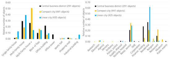 Figure 3 (left) compares the three application cases concerning their construction types in accordance to the list of pre-defined buildings. Based on the high connectivity and the mixture of residential with other uses, the compact city includes a high degree of multi-family houses with commercial use in the ground floor, indicated with “multi-family house +” in the left diagram of Figure 3. Due to the clear separation of zonings, the linear city includes areas with a higher number of industrial buildings and residential areas with single- or multi-family houses. Characteristic for a district with specific task assignment, the central business district includes an increased number of office buildings and office towers.