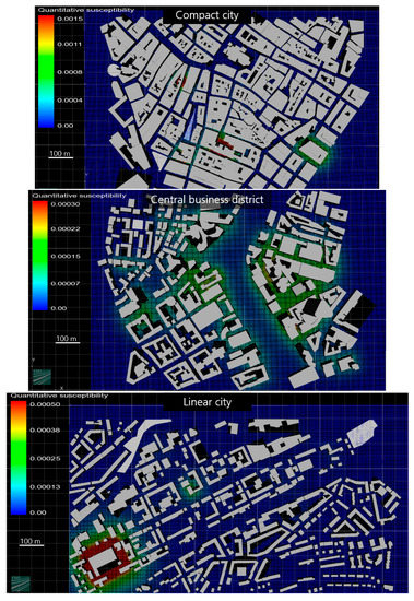 The results underline the characteristics of the three urban forms. A compact city includes a high mixture of object types, no clear zonings and a higher building density, which is apparent in the upper picture of Figure 4. There are several hotspots with a relative high susceptibility. The clear separation of different zonings within the linear city results in area-covering susceptibilities within an elongated area as shown in the middle picture of Figure 4. Broader areas with residential use generate low criticalities. Finally, the lower picture shows the empirical area distributed results for the central business district. Based on the clear assignment of object types, there are many objects with a similar criticality. In opposite to the linear model, the derived susceptibility is slightly higher and there is no local maximum.
