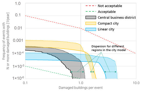 Comparison of the investigated city models within a frequency-number diagram concerning the expected damage and the comparison to criteria of acceptance. Based on the composition of construction types and object uses, each city model results in varying probability that an event with N or more damaged buildings occurs.