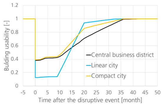 In Figure 6, the high vulnerability for the linear city model is present with the strongest drop of performance at the time of the impact. The smallest discontinuity at t = 0 underlines the robust behavior of the central business district, which is congruent with the results of the risk analysis in Figure 5. Full recovery time of the building usability of the central business district is twice as long as in case of the linear model, which shows a relative short recovery behavior. This circumstance is due to the fact that high-rise buildings have a longer construction time than multi-functional and single-family houses, as shown in the overview in Table A1. Hence, the mixture of different object and construction types of the compact city is also reflected with the performance-time relations.