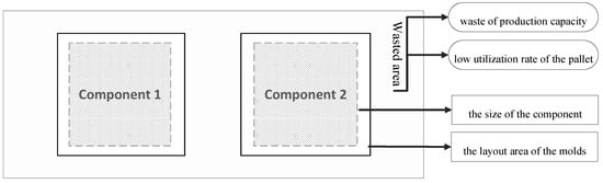 It is worth noting that two of the processes, mold setting and curing, have a significant impact on the component production efficiency and cost. In regards to the flow shop production, several pallets are cured in a kiln during the curing process, where the concrete mix undergoes an accelerated but expensive process. For the curing of the precast concrete, water is consumed by the curing kiln, which is driven by electricity. The curing kiln is limited by a fixed pallet capacity and it takes some hours to cure the precast components loaded on the pallets. Therefore, if more components can be accommodated in the kiln during the curing process, the average curing cost and resource (electricity and resource) consumption for each component are lowered and an increased efficiency of component production can be achieved. In the mold setting process, molds are placed onto the pallets according to the component production layout plan, which determines the number of components on each pallet. The pallet is generally made of steel and can be used a few hundred times. Obviously, the more components loaded on a pallet, the higher utilization rate of pallet, the lower the average curing cost for each component, and the larger the efficiency of component production. Thus, cost and efficiency of component production is directly responsive to the configuration of the mold setting process. Furthermore, from the perspective of the environment, an intensive molding layout could enable lower energy and material consumption (e.g., electricity, water and steel pallet consumption) during the curing process. Similarly, for fixed location production, which normally uses a steam curing method in its curing process, a much more efficient layout plan also helps to reduce the number of pallet cycles. Accordingly, production efficiency can be improved and the resource consumption, production time and curing cost can be reduced as well.