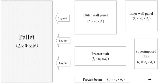 This paper establishes a layout optimization model for scheduling precast components on pallets during the mold setting process. The objective function of this model is to maximize the average utilization of the pallets, considering the constrains inherent to the pallets (capacity/size), to the precast components (demand and size) and to the layout rules (layout methods and positional relationship of components). To the best of the authors’ knowledge, there is no other formulation in the literature for optimizing the mold layout plans of precast components production. The proposed model is solved using a heuristic algorithm. The empirical analysis illustrates that the model and the algorithm proposed in this paper are highly operable and can effectively improve the utilization rate of pallets. The approach provides strong practical benefits for component manufacturers seeking to optimize their production plans, shorten production time, and reduce production costs. In turn, the approach may be expected to enhance competitiveness in the industrial buildings sector. Furthermore, the approach brings significant environmental benefits, such as reducing the water and electricity consumption and enhancing the utilization rate of steel pallets.