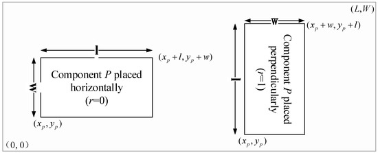The constraint in Equations (3) and (4) ensures that the component layout will be limited within the pallet size. As shown in Figure 3, components could be placed either horizontal or perpendicular to meet the parallel requirement. As shown in Table 2, we adopt a coordinate constraint to achieve this condition, considering the convert of component placement. In order for the components to be arranged within the pallet dimensions, the formulas in the table will need to be satisfied.