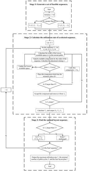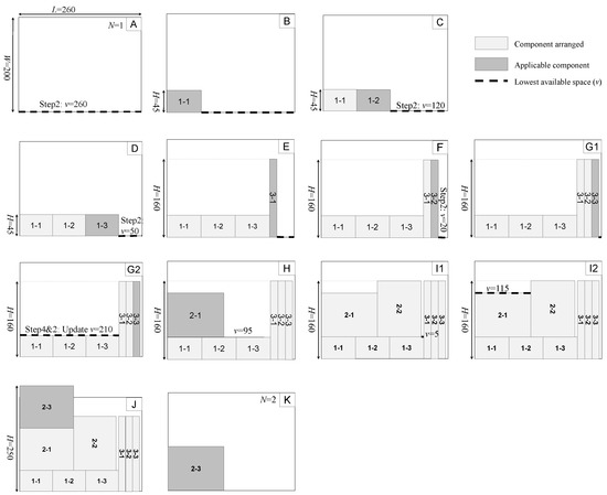 Stage 2 is used to calculate the utilization rate of the selected sequence from Stage 1. This algorithm establishes an updating principle to place the components in the sequence (see Step 3). Also, the two placement strategies (horizontally and vertically) of components are considered. The specific procedural steps are outlined below.