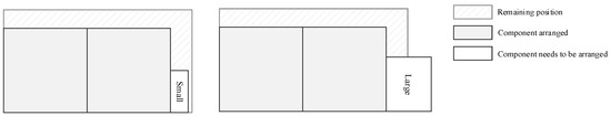 Stage 1 is used to generate a set of feasible sequences. If the number of the component types is i, the maximum number of production sequences is i!. Assume there are three component types (A, B, C), thus a total of 3! = 6 feasible sequences can be generated as follows: ABC, ACB, BAC, BCA, CAB, CBA. However, if the number of the component types becomes large (being greater than eight in this case), an enormous number of sequences would be created, which would result in a high computational cost. In order to reduce the unnecessary computation time of this algorithm, a classification method is presented. Notably, as shown in Figure 6, a small component is more capable of being be placed into the remaining positions than a large one, which can improve the utilization of the pallet. Therefore, sequences where small components are at the back can generally achieve better solutions. According to this, we equally divide all the components into two groups: small and large, with the large group always being in the front of the sequence. The number of these two groups’ component types are a = int(i/2) and b = i-int(i/2), respectively. For each group, the sequences are generated via random permutations. For example, nine kinds of components in total need to be produced. We firstly divide them into two groups, where the large group contains a = int(9/2) = 4 kinds of components while the small group contains b = 9-int(9/2) = 5, then 4! = 24 permutations for the large group and 5! = 120 for the small group can be generated. Thus a total number of 4! × 5! = 2880 sequences are finally created, which has declined exponentially in comparison to the result of 9! = 362,880 for the ungrouped method. In short, in this stage, the feasible sequences are generated by the following rules: if the number of the component types i is greater than eight, then , where a(b) is the large(small) group’s component type, and a + b = i; otherwise .