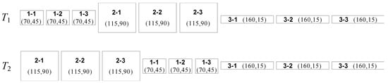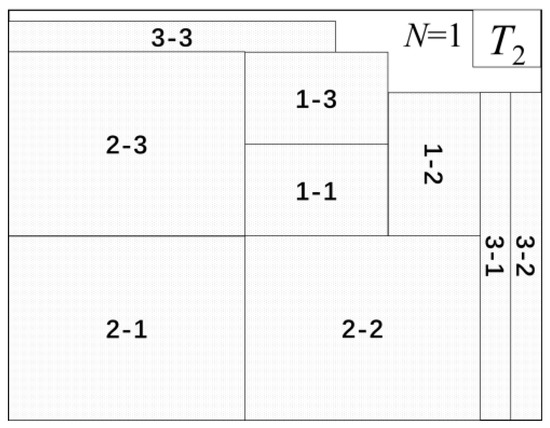 For understanding how Stage 2 runs and how the updating principle works, a demo sequence (sequence T1) is proposed to test it. Nine components in total are needed for arrangement, and the size and order of components in T1 are given in Figure 7. Figure 8(G1) and Figure 8(G2) show the updating principle for the lowest available space (Step 4). The width of the lowest available space (v) in Figure 8(G1) is equal to 5, which is not enough to accommodate any components, so v is updated. The updating principle for the lowest available space is to raise its height to the penultimate lowest space when it’s compared to the current one. Thus, the height of the lowest available space (hv) is raised from 0 (see Figure 8(G1)) to 45 (see Figure 8(G2)). The principle can also be illustrated in Figure 8(I1) and Figure 8(I2), where the hv is raised from 45 to 115. Figure 8J shows component 2–3 placed in a temporary position before Step 5 runs. However, due to H = 250 > W = 200, component 2–3 has to be canceled. Then, another pallet to place component 2–3 is required. Figure 8K shows the last placed component in a second pallet (N1 = 2). When it is finished, all components in sequence T1 have been arranged, then the average utilization rate is calculated (U1 = 45.87%).