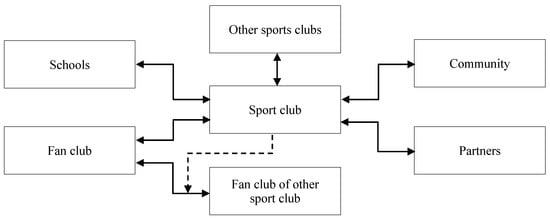 With regard to these relationships we can speak of pro-social behaviour between the sports club and the public. This behaviour consists of significantly unilateral activity of the club towards the public without any counter value expected by the club [59]. These activities can, for instance, include supporting non-profit organizations, such as UNICEF, as well as children’s hospitals, children’s homes, and so on [60,61,62]. The behaviour within these relationships is very empathic, and these individual activities are often even altruistic.