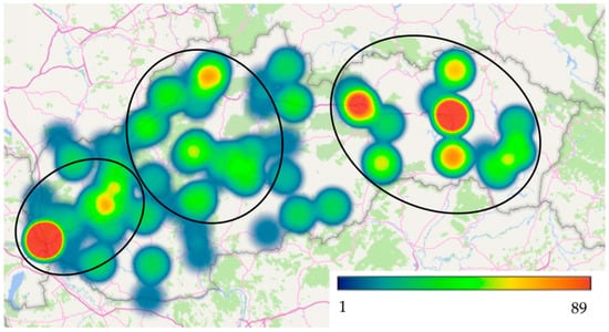 Figure 4 shows the intensity of cooperation in individual areas. The intensity of cooperation represents the number of cooperating schools and clubs in individual cities. As can be seen, there are three cooperation clusters formed in Slovakia. One is situated in Western Slovakia, with the highest intensity in the capital Bratislava. The second is situated in the area of Central and Northern Slovakia, with highest intensity in the area of the regional cities Žilina and Banská Bystrica. The third cluster can be observed in the area of Eastern Slovakia, with the highest intensity in the cities Prešov, Poprad, and Košice. It can be established on the grounds of this observation that the cooperation of schools and tennis clubs takes place in Slovakia, especially in larger cities.