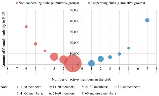 The number of active members also has, as mentioned above, an impact on the funding of tennis clubs with regard to individual rules for the distribution of funds. Figure 6 shows the impact of results of cooperation with schools and the number of active members on the funding of individual tennis clubs.