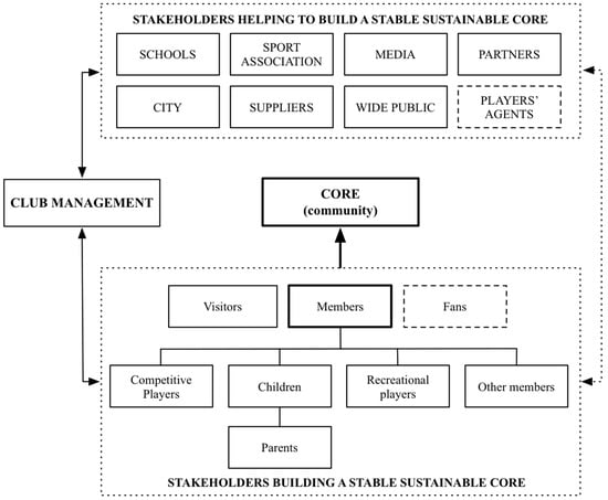 Hoye et al. [51] specify stakeholders of sports clubs and their expectations but, in our opinion, they omit two essential subjects, namely, schools and parents. Another significant aspect that is omitted in specialised literature is the division of these stakeholders to two basic groups, namely, stakeholders by means of which the core of the organization is formed and stakeholders forming the core (Figure 7). This division is important, in our opinion, with regard to the management of these groups and the approach to them. However, this does not exclude the fact that these two groups are mutually influencing each other. It should be, primarily, the management of the sports organization that should strive for their interconnection.