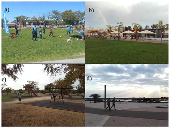 Parque de Lazer das Figuras (a,b); Parque das Cidades (c); and Parque Ribeirinho de Faro (d) (K. Herman photo—all rights reserved).