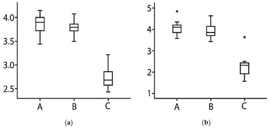 Box-and-whisker plots of the survey result for: professionals (a); and local residents (b). A is Parque de Lazer; B is Parque Ribeirinho and C is Parque de Cidades. Median values are drawn in the boxes represent the inter-quartile distances, whiskers indicate the range of data with exception of outliners (distance from the edge of the box between 1.5 and 3 times of box length, shown as small circles).