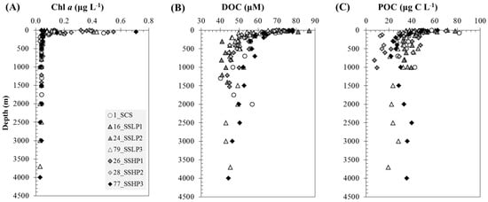 Figure 2 shows the scatter plots of chlorophyll a, DOC, and POC. The highly productive areas at the shelf (stations after Sta. 16) and upwelling region (Sta. 28) and the less productive central Sulu Sea (Sta. 79) were clearly delineated by surface chlorophyll concentrations (Figure 3B). The band of subsurface chlorophyll maximum along the South China Sea—Sulu Sea section is also illustrated. The inflow of the core of low-chlorophyll concentrations at ~200 m (Figure 3B), located at the same depth as the core of high-salinity, subtropical, lower water (Figure 3 in [33]), is not blocked by the sills at the Mindoro Strait and Panay Strait. This supports the results of previous studies in the Sulu Sea [33,34,35,36] and of [30], which used hydrographic data obtained from the same research cruise. These data show the different potential temperature, salinity, and potential density profiles between the South China Sea and Sulu Sea starting at ~400 m and below due to the sills at Mindoro Strait and Panay Strait (~440 m and ~570 m, respectively) [37] that confine the deep waters of the South China Sea to its basin. As a result, surface waters up to a few hundred meters freely enter the basin, while waters overlying the sill depth spill over and ventilate the deeper waters of the Sulu Sea.