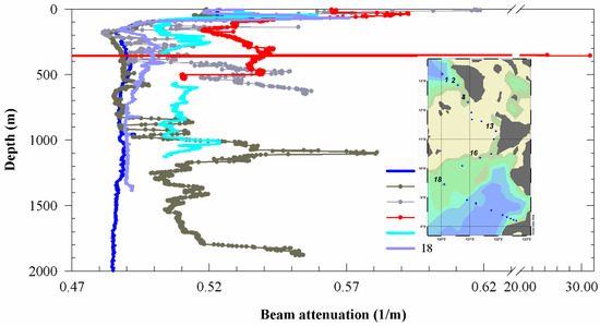 Beam attenuation profiles of selected stations from the SCS, across the sills at the Mindoro and Panay Straits, to the northwest basin of the Sulu Sea. The inset map shows the location of stations, namely: Sta. 1 (SCS), Sta. 2 (SCS—Sulu Sea deep connection), Sta. 4 (Mindoro Sill wall), Sta. 13 (Panay Sill), Sta. 16 (Sulu Sea low-productivity station), and Sta. 18 (Sulu Sea northwest basin). Values below 2000 m all the way to ~2700 m for Sta. 1 are ~0.485 m−1 but are not shown.