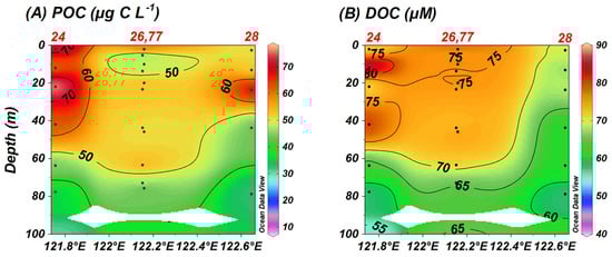 Water-column DOC concentration ranged from 40 to 87 μM, and POC concentration ranged from 7 to 82 μg C L−1. The average DOC and POC concentrations at specific depth layers are shown in Table S1. Mixed layer DOC was highest at Sta. 24 and Sta. 77 (avg. 77 μM), and lowest at Sta. 79 (avg. 60 μM). These DOC values are within the range reported for surface waters in general [2,4], in the northern South China Sea in 2002–2004 [38], in the East China Sea in 2009–2011 [39], and in the east Taiwan Strait in 2013 [40]. Furthermore, these values are typical of the high values found in tropical and subtropical latitudes [3]. For POC, all sampled stations were within the range measured by [28] at the four stations occupied in the Sulu Sea in June 1972. Sta. 24 had the highest mixed layer concentration (avg. 68 μg C L−1 POC), while Sta. 16 had the lowest (avg. 40 μg C L−1 POC). High-productivity areas generally had higher DOC and POC than low-productivity areas except for Sta. 24, which had the highest DOC and POC despite it being a low-productivity area, and Sta. 28, which had a reasonably low DOC due to upwelling subsurface waters with lower DOC (see Section 3.3 for the discussion on upwelling). For all the occupied stations, including the South China Sea, DOC and POC made up 95% and 5% of TOC, respectively, which follows the typical distribution in oceanic waters [1].