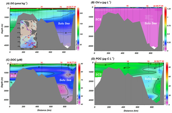 Sections of full–water column (A) DO; (B) Chlorophyll a; (C) DOC; and (D) POC along a transect from the SCS to the Sulu Sea. Inset map in “A” shows the station locations.