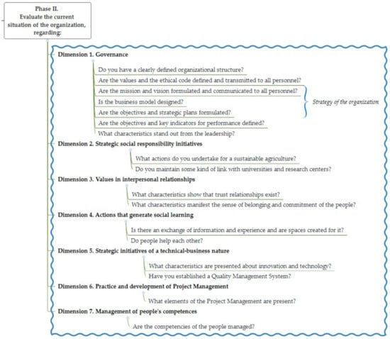 • Phase II. Evaluating the current situation of the organization regarding the dimensions identified (Figure 3), related to the application of the OCPM and the integration of strategic initiatives that contribute to the sustainability of the AS. Determining its current situation will reveal where the organization is by identifying the strengths of the governance system and, more importantly, by identifying the weaknesses that must be resolved in order to evolve.
