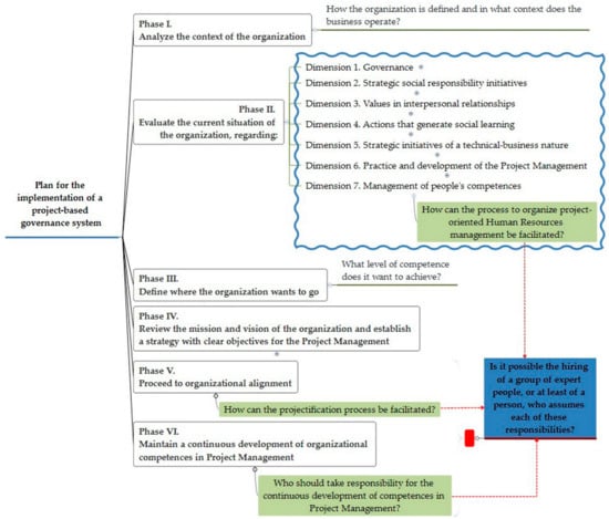 • Phase V. Proceeding to organizational alignment. According to the IPMA OCB [11], this phase is about: (1) aligning the projects with the processes of the operations that are carried out in the organization; (2) aligning the functions that the projects entail within the existing organizational structure; and (3) integrating the project approach in the culture of the people, through awareness-raising activities, training, certification, etc.