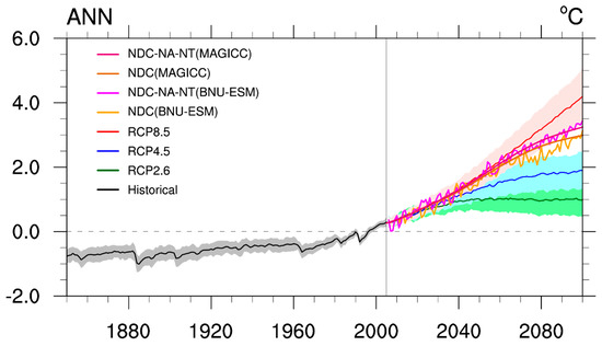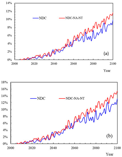 Figure 4 shows the time evolution of the global surface temperature of the NDC and NDC-NA-NT simulated by MAGICC and BNU-ESM, and CMIP5 multiple model simulations under representative concentration pathways (RCPs). The temperature shows a significant increasing trend under the NDC and NDC-NA-NT scenarios, with warming falling within the multiple model ensemble of RCP8.5 and RCP4.5. At the end of the 21st century (2081–2099), the temperature is projected to increase by 2.7 °C and 3.1 °C compared to the average of 1986–2005, which is in the range of RCP4.5 (2.6 °C ± 0.8 °C) and RCP8.5 (5.2 °C ± 1.2 °C) [29]. The warming of the NDC-NA-NT condition is about 0.4 °C higher than that of the NDC condition, and both of these scenarios project that it is unlikely that global warming will fall below 1.5 °C at the end of the 21st century. The spatial temperature change of the NDC and NDC-NA-NT conditions can be found in Figure 5.