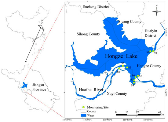 Hongze Lake (33°06′N–33°40′N, 118°10′E–118°52′E) is located in western Jiangsu Province, China. This lake receives water from the main branches of the Huai River, Chi River, New Huaihong River, Xinbian River, and Xinsui River. The lake’s catchment is 15.94 × 104 km2. Hongze Lake has a high water exchange rate and large variations in its water volume; therefore the lake’s water level varies seasonally [23]. Hongze Lake serves as the first important transfer-store along the path of the SNWDP-ER. The eastern part of Hongze Lake includes several important inlets and outlets: this is where the Huai River enters the lake and Hongze Lake feeds into the river, as well as the location of the SNWDP-ER’s inlet and outlet (Figure 1).