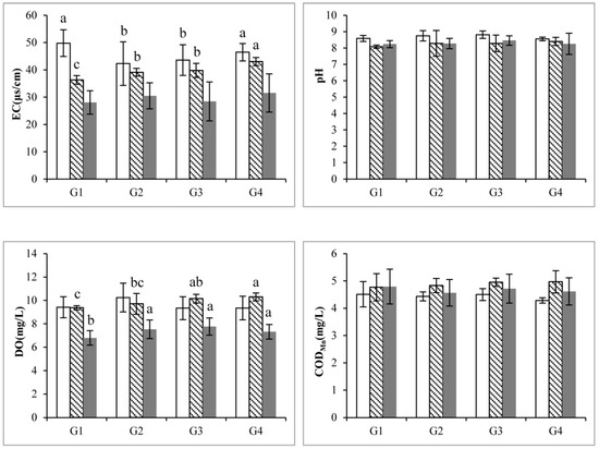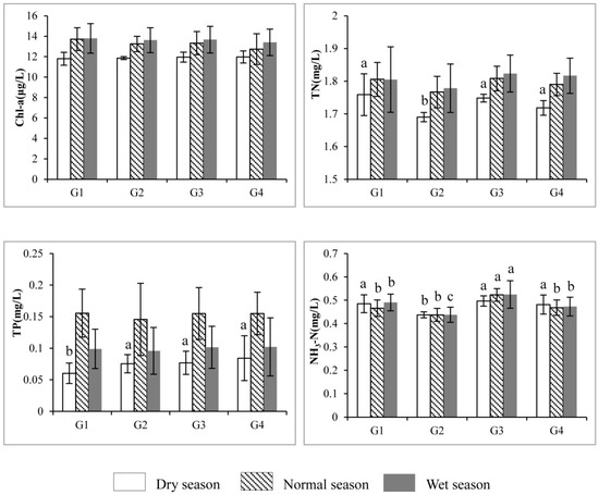 As shown in Figure 3, the results of multiple comparative analyses prove that the five water quality parameters of G1, G2, G3, and G4 groups exhibit some changes. In normal and wet seasons, the average concentration of ammonium nitrogen in the G3 group is significantly higher than that of the other groups (p < 0.05). In the dry season, the average concentration of TN in the G2 group is significantly lower than that of the other groups (p < 0.05), the average concentration of total phosphorus in the G1 group is significantly lower than that of the other groups (p < 0.05). In dry and normal seasons, the average concentration of EC in the G4 group is significantly higher than that of G2 and G3 groups (p < 0.05). In normal and wet seasons, the average concentration of DO in the G1 group is significantly lower than that of G3 and G4 groups (p < 0.05). Meanwhile, there were no significant variations detected in pH, CODMn, and Chl-a. The mean concentration of TN in all groups was over 1.0 mg/L during all three seasons, as the TP was over 0.05 mg/L. When comparing this data with the values outlined in the Grade III water standard shows, our research indicates that water pollution is serious in the study area.