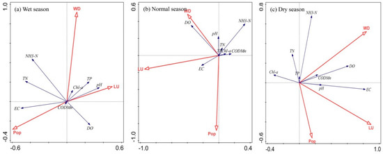 The results of RDA: water quality parameters and environmental variables in the wet season (a); normal season (b); and dry season (c).