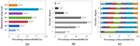 State of multidimensional poverty. Three graphs respectively show the percentages of households with different poverty dimensions (a), households with different degrees of multidimensional poverty (b), seven dimensions in each level of multidimensional poverty (c). Only 4.74% households did not have any dimension of poverty (not shown in the figure).