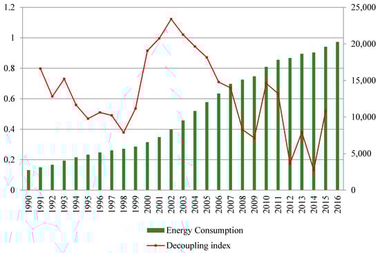 Elastic coefficient and energy consumption of decoupling of Zhejiang Province. Note: The original data were obtained from the Zhejiang Statistical Yearbook [] and the China Energy Statistics Yearbook [].