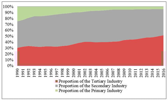 Proportional contribution to the GDP of Zhejiang Province (1990–2016). Note: The original data were obtained from the Zhejiang Statistical Yearbook.