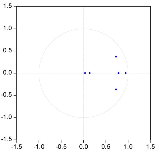 A stationary test of the VAR model was conducted. Figure 4 shows the results of the test of model stationarity by AR root, and clearly, the VAR model’s inverse roots of the AR characteristic polynomial were all within the unit circle, which satisfied stationarity. Therefore, the VAR model can be further developed into the SVAR model.
