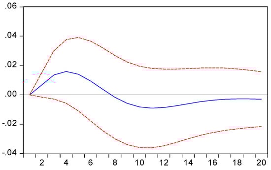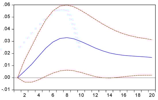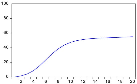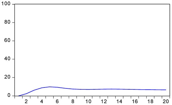 Figure 6 depicts the response of energy consumption to an urbanization shock. The positive impact of urbanization on energy consumption in the early period increased rapidly and peaked in the eighth period, which was in line with the actual situation. The increase in the population caused by urbanization will clearly cause a considerable increase in energy demand in the early stage. Increasing the quality of urbanization and increasing urban resource allocation efficiency can weaken the impact of urbanization on energy consumption and may cause the impacts to slowly weaken in the future []. However, the sustained impact appeared a relatively long period, which poses a challenge to the target constraints of energy consumption for a provincial energy planning.