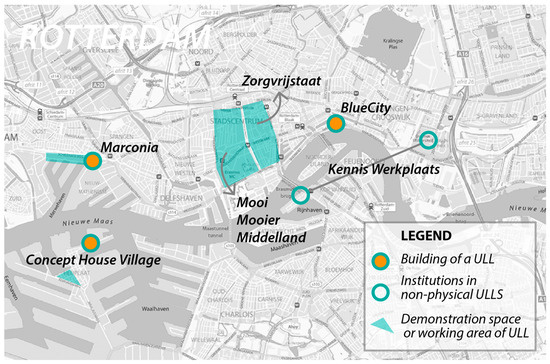 Map of the city of Rotterdam with the six Urban Living Labs (ULLs) mapped.
