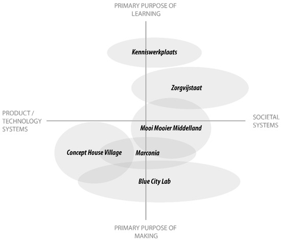 The six Labs show clear differences in their purpose of value creation or innovation. Figure 2 shows the six ULLs mapped according to their innovation purpose. The purpose of some of the Labs is more focused on learning together (Kenniswerkplaats, Zorgvrijstaat, and to some extent Mooi Mooier Middelland and Blue City Lab), here the value creation is more focused on innovation of the societal systems. These learning and knowledge development processes generate different values across the case examples. For example, learning can be a means to acquire credibility and to demonstrate that an alternative model is sustainable and feasible (Zorgvrijstaat); a means to expand research and education networks (Concept House Village); or the purpose for which the stakeholders come together (Kenniswerkplaats). Finally, it can be the way to include new actors within the cooperative, and also to reach the people and institution that could help to improve the experiments and to reduce bureaucratic issues in the future (Marconia, Mooi Mooier Middelland, and Blue City Lab). In other Labs, the value creation is more focused on creating product and technology systems, here the purpose of co-creation is primarily making together (Blue City Lab, Concept House Village, Marconia, and to some extent Mooi Mooier Middelland).